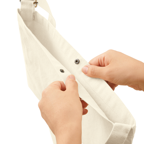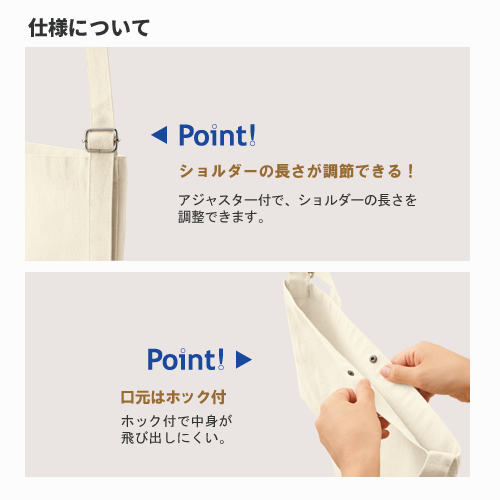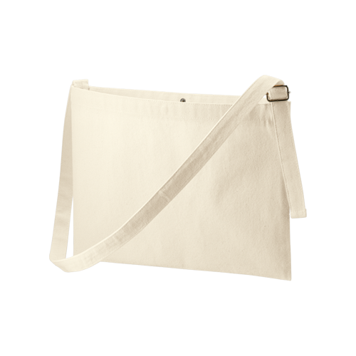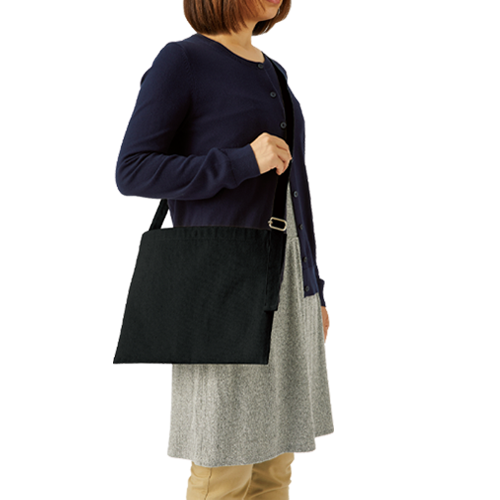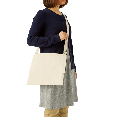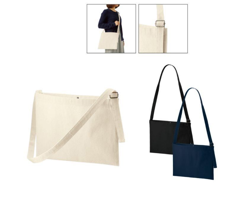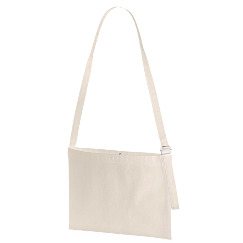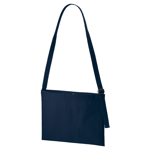 流行のショルダーを短くして持ち歩くスタイルも可能なサコッシュは人気のナチュラル、ミッドナイトブルー、ナイトブラックの3色をご用意しており、加工も単色からフルカラーまで対応しております。