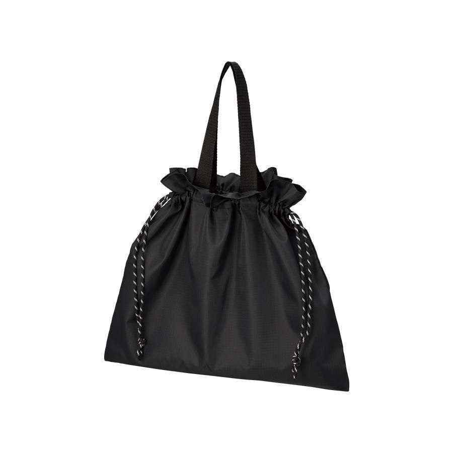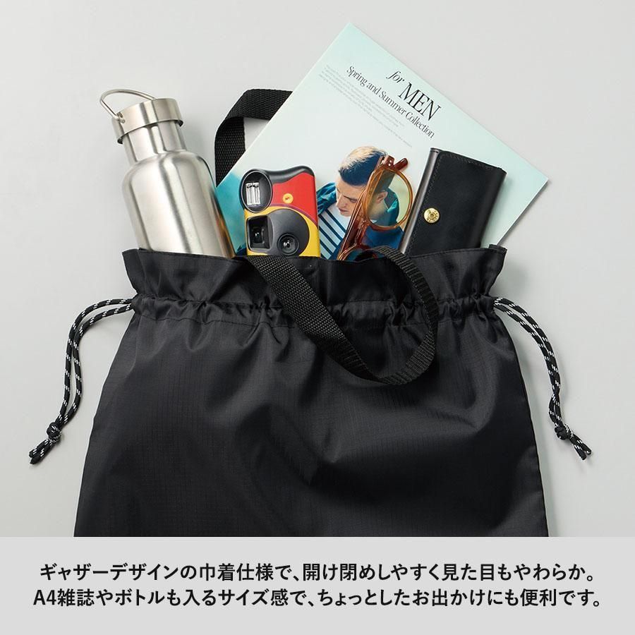 口元のギャザーデザインとリップストップ生地でユニセックスな印象で 巾着の柄紐もアクセントになります。